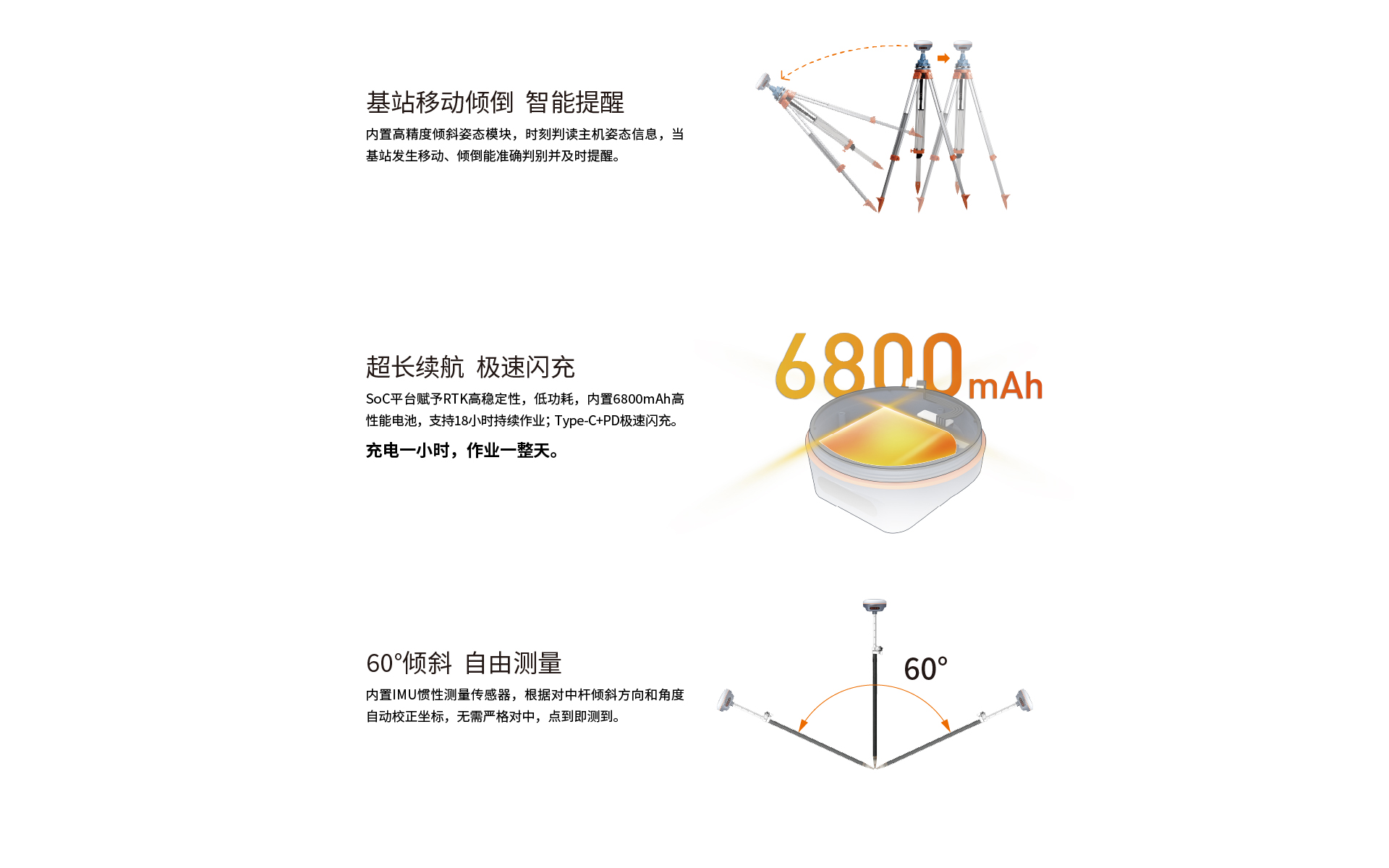 慣導傾斜測量 | 內(nèi)置IMU慣性測量傳感器,支持慣導傾斜測量功能,根據(jù)對中桿傾斜方向和角度自動校正坐標。 |