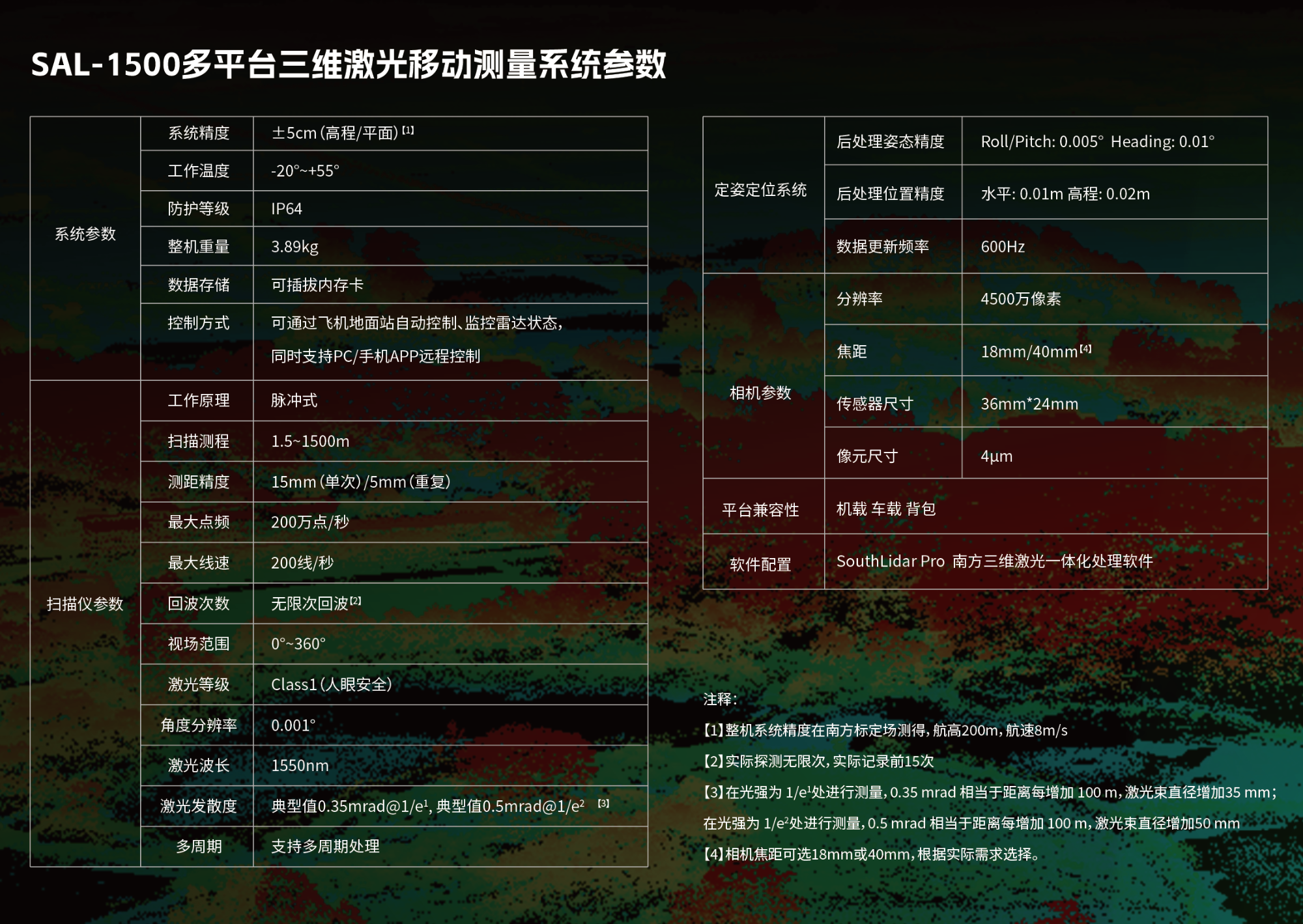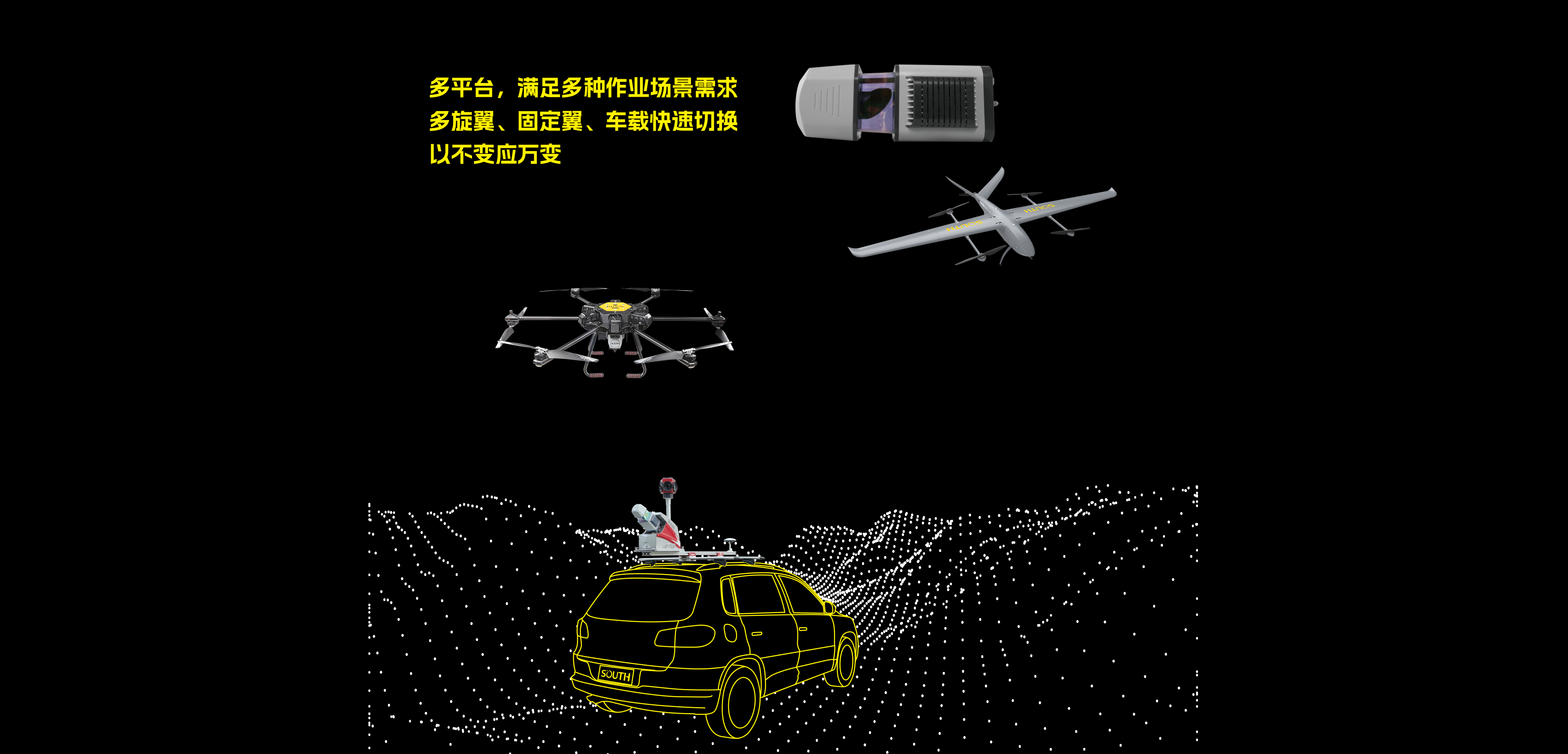 SAL-1500是南方測繪自主研發(fā)的多平臺(tái)三維激光移動(dòng)測量系統(tǒng),360度視場角,無縫切換旋翼無人機(jī)、固定翼無人機(jī)、車載等多種平臺(tái),實(shí)現(xiàn)一機(jī)多用。
