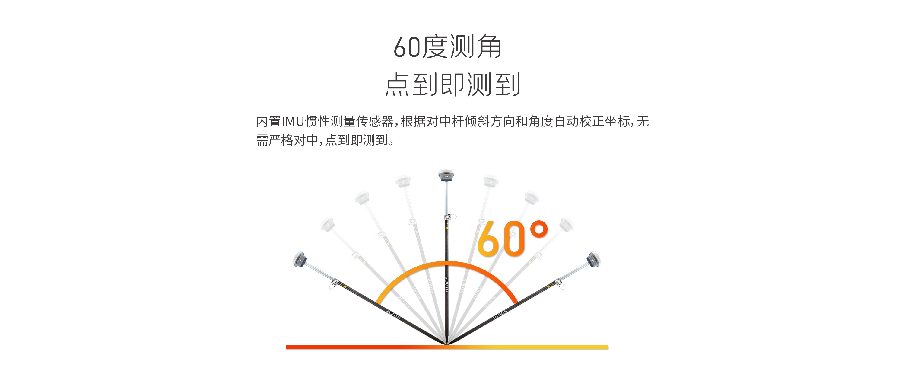 內(nèi)置IMU慣性測(cè)量傳感器,支持慣導(dǎo)傾斜測(cè)量功能根據(jù)對(duì)中桿傾斜方向和角度自動(dòng)校正坐標(biāo)。